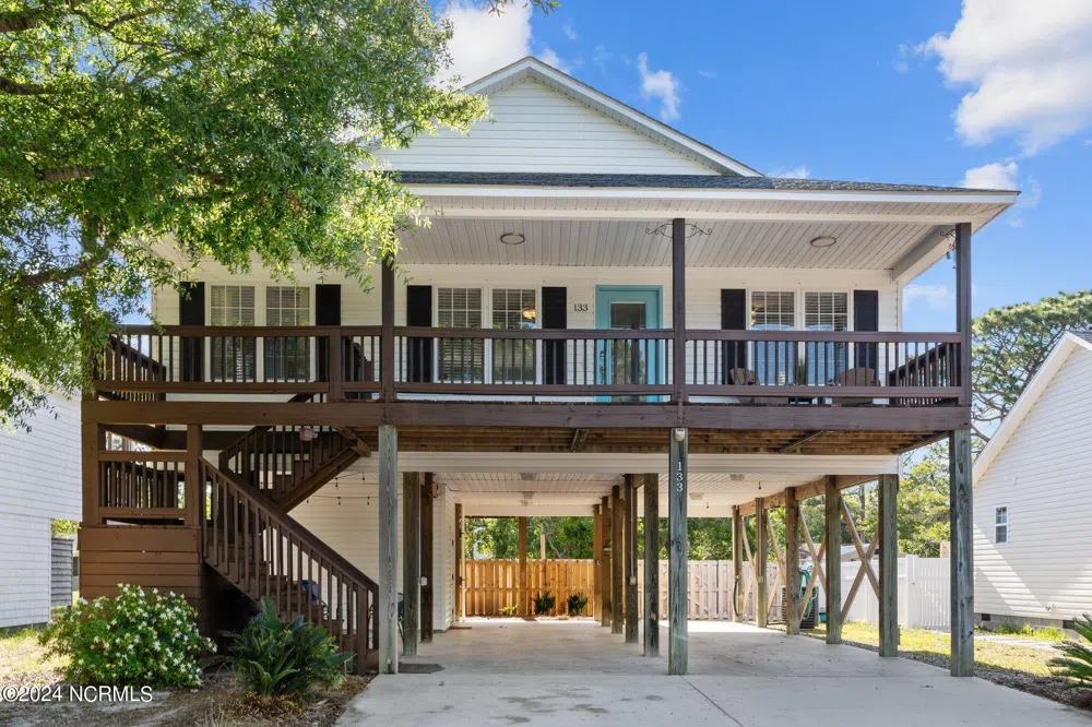 Rediscover Paradise - Your Beach Dream House Awaits! After a GLOW UP inspired by the VIBRANT sunny shores and SPARKLING waters of Oak Island, this charming home is ready to absolutely DAZZLE you with a whole new look inside and out including NEW back deck and FRESH stain on the expansive front porch. Located with convenient access to the beach via the 9th & 20th Street walkovers, Veteran's Park and Middleton Bridge all just a few short blocks away, this home is a quick golf cart ride to all that Oak Island has to offer. Step inside to a large living space with vaulted ceiling and abundant light opening directly to a kitchen that includes a four seat counter bar plus an eat in dining area as well as a large sepaarate laundry room with pantry. Relax and unwind in the spacious primary suite with abundant natural light and complete with a large walk-in closet and en-suite bathroom. Two additional bedrooms and another bathroom provide ample room for family or guests and two linen closets allow you to keep everything organized and tidy with effortless ease. Enjoy the beauty of the outdoors from the comfort of the sweeping front porch or back screened porch and deck. Whether you're sipping your morning coffee or hosting a gathering with friends, these areas are perfect for soaking in the sunshine or enjoying the ocean breeze. The large, open yard is surrounded by a newer wooden privacy fence. The paver patio with fire pit is a great space for outdoor entertaining and there's even plenty of space to add a pool. There's loads of parking or additional outdoor living space under the house along with extra storage for keeping all your beach toys easily accessible. From the moment you walk through the front door, you'll feel the pull of the ocean calling you home. Don't miss the opportunity to make this lovely house your new home sweet beach home today!