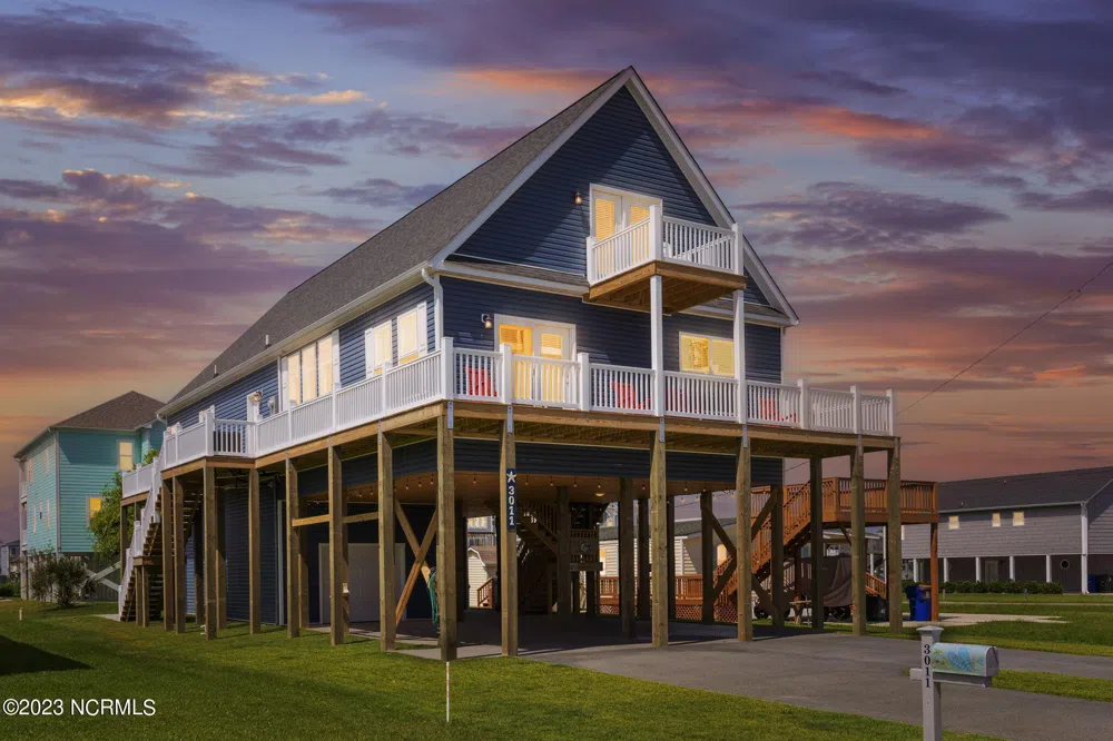 THIS IS THE ONE! Your beach home dreams are coming true. This newly built Surf City beach house checks all the boxes and then some with a 10 year structural warranty, warranty on all appliances and systems, and upgrades galore! The seller had this built to be ready for hurricane season by adding the Coastal High Hazard standards package. Nestled on a canal street is this 5 bedroom, 3 bath, 2 living space home placed on 14 foot pilings making it perfect for those who would like to store a boat or RV. The home boasts 3 entry locations with an all weather entry right into the kitchen area. Prepare to be wowed with the expansive decks and tons of windows to let in the beauty of Topsail Island sunrises and sunsets. You will love the fabulous furnishings chosen that stay!! This is truly a turn-key beach home. Upon entering the home you will find a large open living, dining, and kitchen area. Stainless steel appliances and large kitchen island make cooking time a breeze. Make your way down the hall to two bedrooms and a guest bathroom. At the end of the hall you are welcomed by the enormous primary suite ready for its new owner. The expansive bathroom with separate soaker tub and large walk-in closet will not disappoint. Head upstairs and find 2 additional bedrooms separated by a huge 2nd living space and full bathroom. Each bedroom has its own private deck to enjoy the North Carolina sunshine. Not last on the list is the 15 x 38 ft garage area under the home. The two car tandem garage has plenty of room for whatever your heart desires. Currently it is being used to store the golf cart and as a separate living room/hang out space. This home is perfect served as a primary residence or income producing beach house. Ask your real estate professional to see the list of upgrades and house specs in agent documents or reach out today for more info!